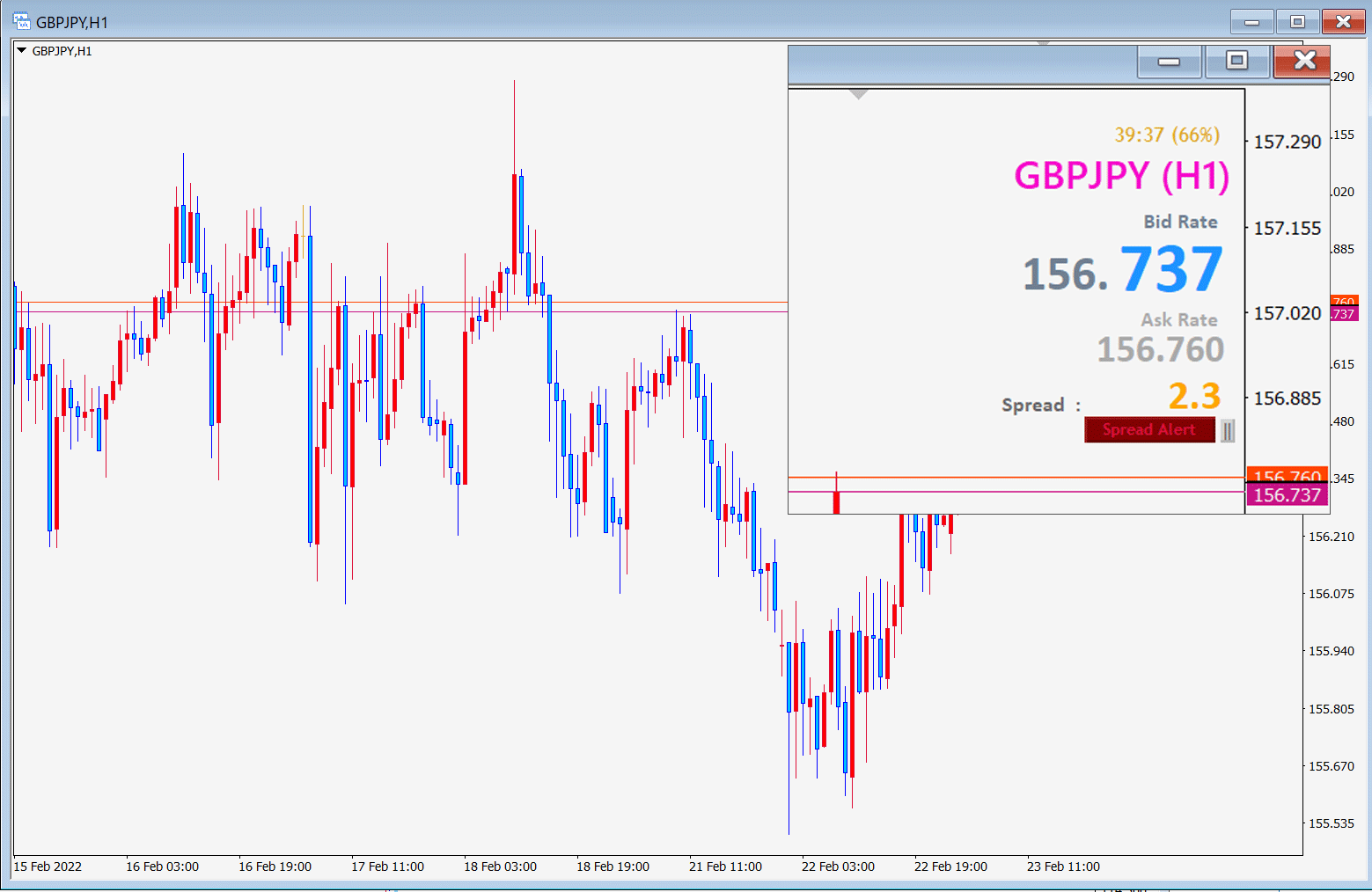 ※ スプレッドアラートは、ご自身で任意のpips幅に設定できます。また、"SpreadAlert"ボタンを押すことによってアラート機能のON/OFF切り替えが可能です。