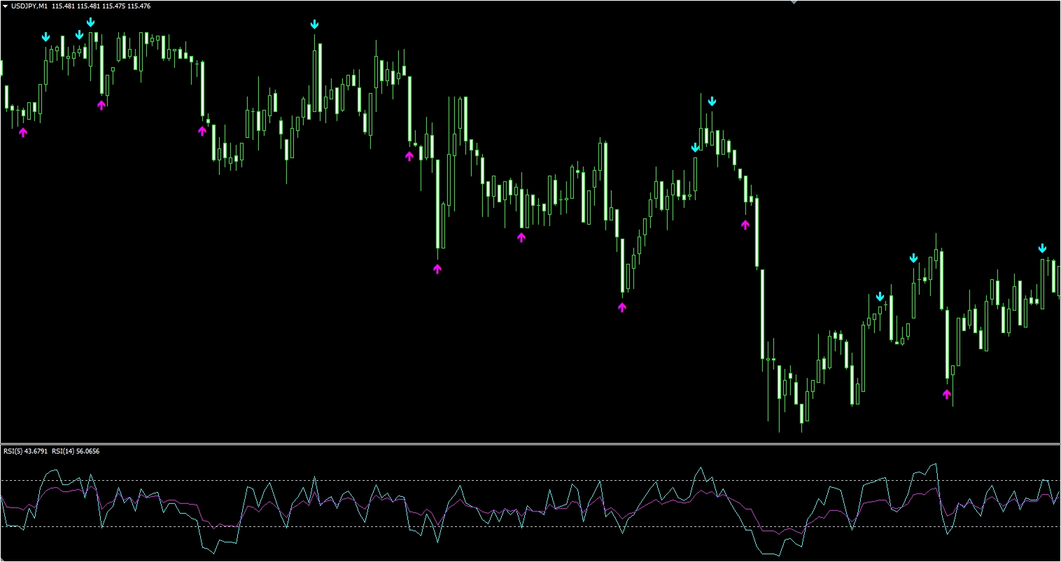 短期RSIと長期RSIで設定値以上の乖離があった時にMT4チャート上にサインが出ます。