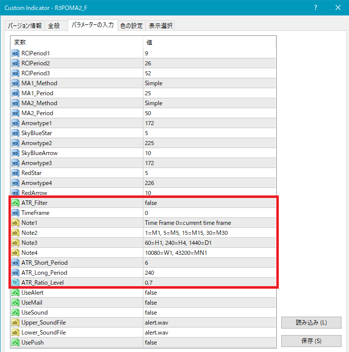 本体インジケーターには、ボラティリティ(値動き)の小さな相場を避けることを目的として、ATR比を使ったマルチタイムフレーム対応のボラティリティフィルターが実装されています。