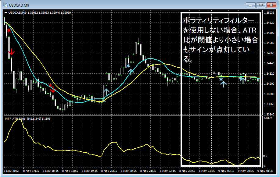 ボラティリティフィルターを利用する場合、ATR比が指定した閾値(ATR_Ratio_Level)より大きい場合のみサインが点灯します。