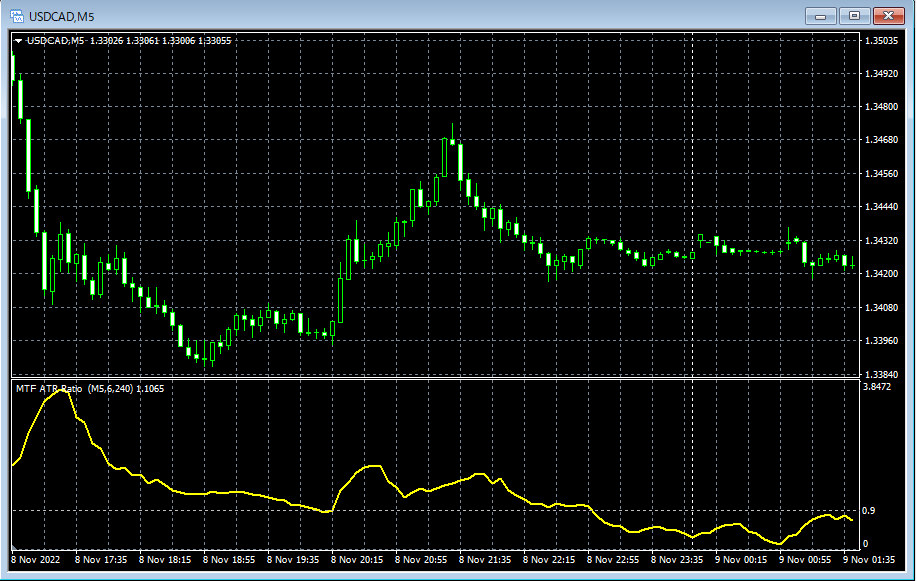 本商品には、ATR比(短期ATR/長期ATR)を表示するインジケーター MTF_ATR_Ratio_XXXXXXXX.ex4 が付属しています。
