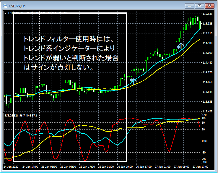 さらに、ボラティリティフィルターやトレンドフィルターを使うことによって表示されるサインを絞ることもできます。これについては後述します。
