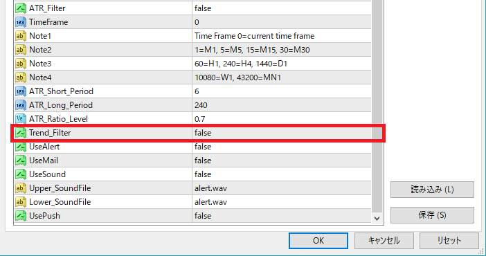 トレンドフィルターを使用する場合には true、使用しない場合には false を選択する。
