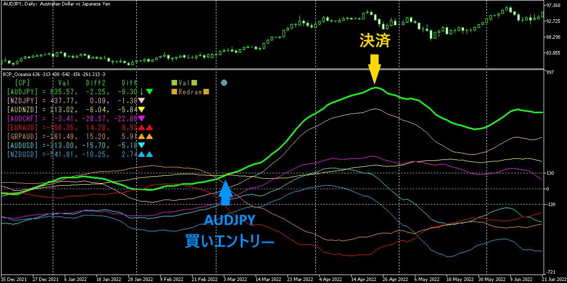 8本のチャートが収束している状態(緑色範囲矢印「非エントリー区間」)の後、最初に通貨ペアAUDCHFが、-15.0の閾値を超えて下落してきたので、売りでエントリーします。その後一旦は戻しますが、-15.0のラインまでは戻らずに再び下落を続け、約8時間後に最小値を付けました。ここで決済すれば、約40PIPSの利益になります。