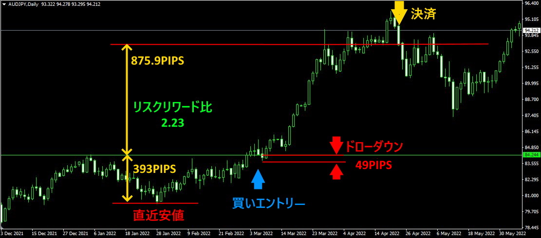 買った時点からのドローダウンが少なく、翌々日には含み益となり、その後グングンと上に伸びて行きました。リスクリワード比が大きい損小利大の理想的なトレードが自然に出来るのが、本インジケータを使った日足トレードの特徴となっています。