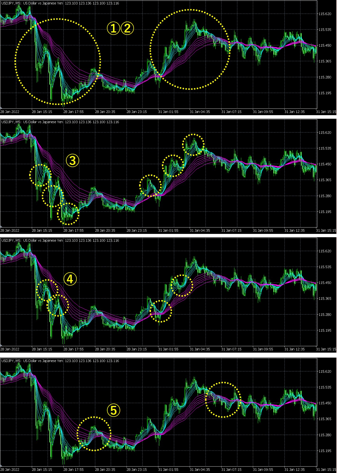 - 短期グループと長期グループの距離が離れている場合、その長期トレンドは強い