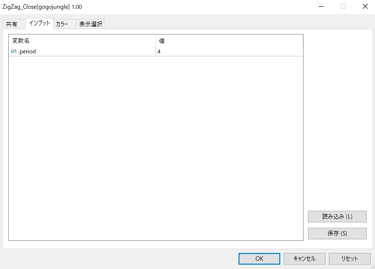 これを更にわかりやすくするために、ZigZag_Closeの設定を2から4に変更します。
