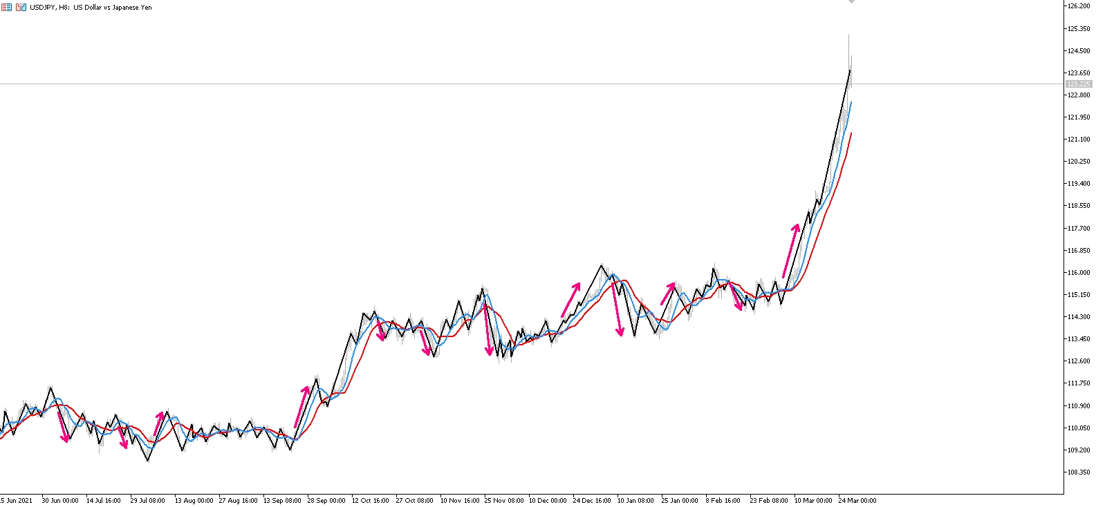 短期移動平均線が中期移動平均線をクロスしてトレンドが出るのは広く知れ渡った王道の手法です。