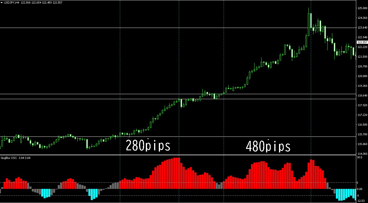 ↑USD/JPY 4H 最近の相場では280pipsや480pips(縦点線~縦点線まで)も取れています!!