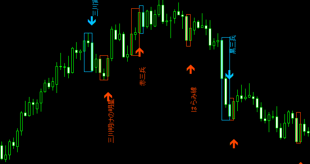 チャート上に表示されるローソク足パターン名称は日本語で表示されますが、メールで送信されるパターン名称はローマ字表記となります。(日本語は文字化けするため)この点ご了承下さい。