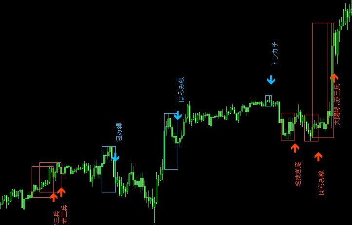 ・2本以上のローソク足で成り立つパターンを検出した場合、ボックスで見やすく表示。(ボックスを非表示にすることも可能)
