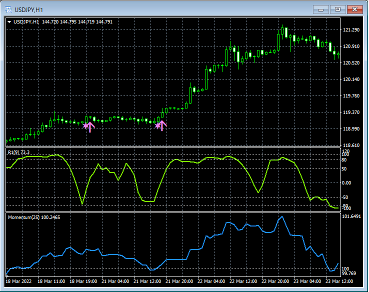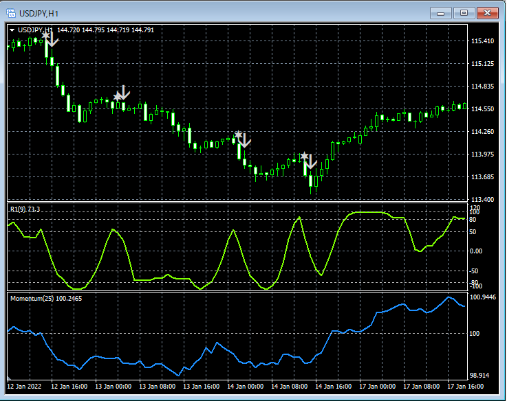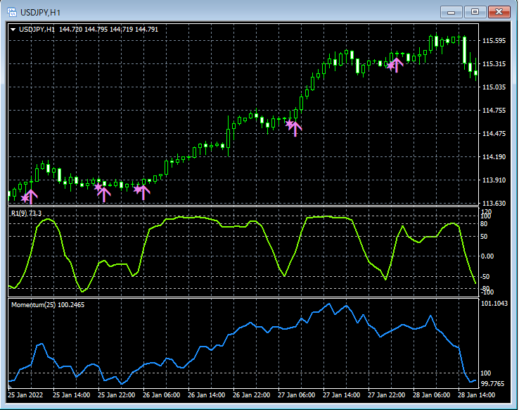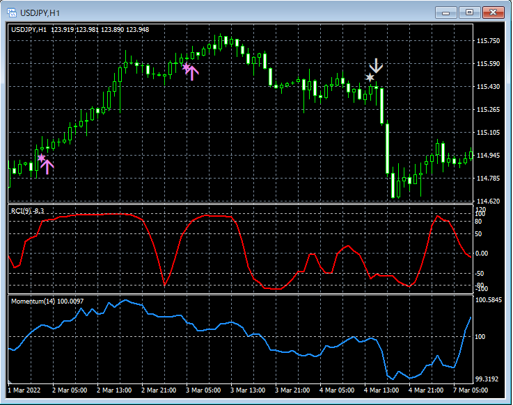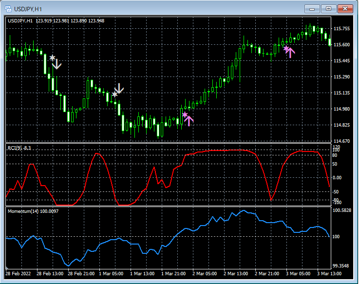 この矢印インジケーターのコンセプトは、「大きなの流れはモメンタムで判断し、短期的な流れはRCIで判断しエントリータイミングをはかる」というものです。