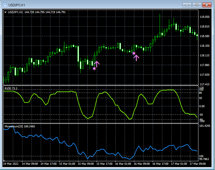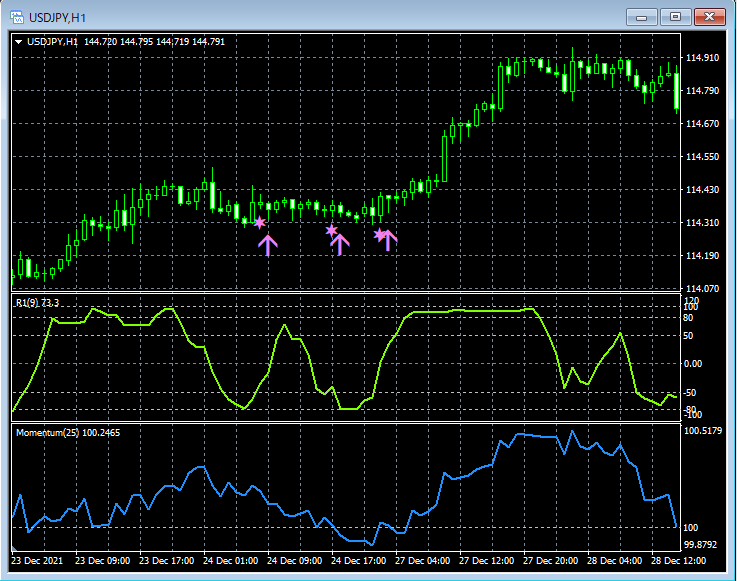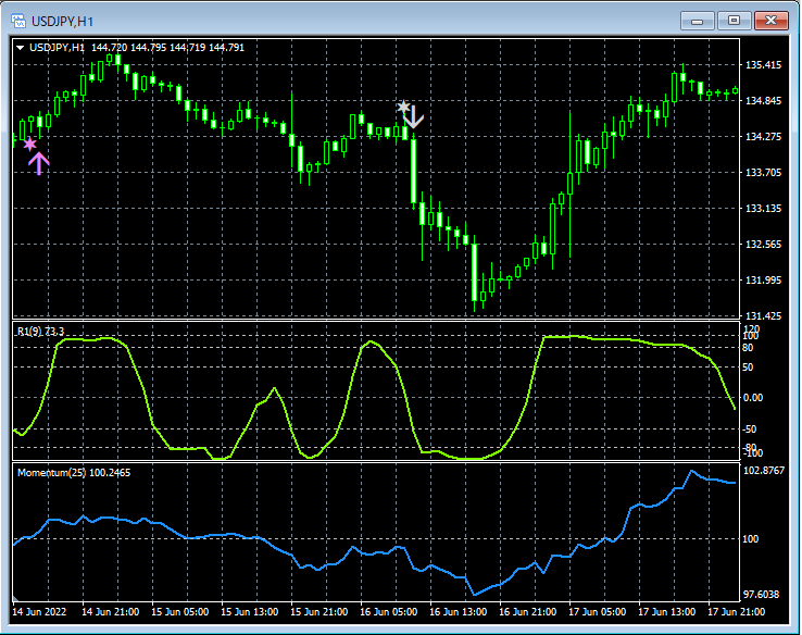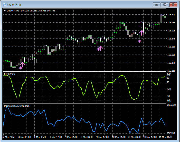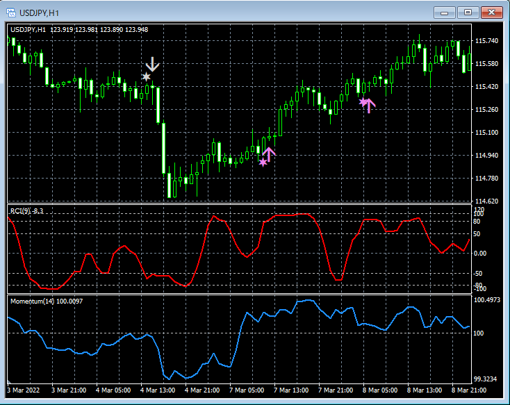 RCIが買いレベルを下から上へ抜けたときに、モメンタムが100以上ならばバイオレット色の星印が点灯します。