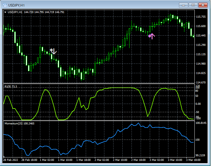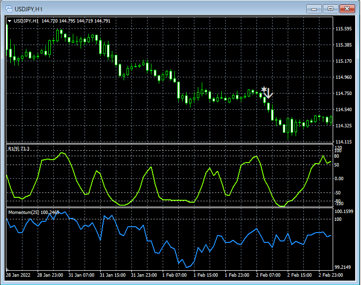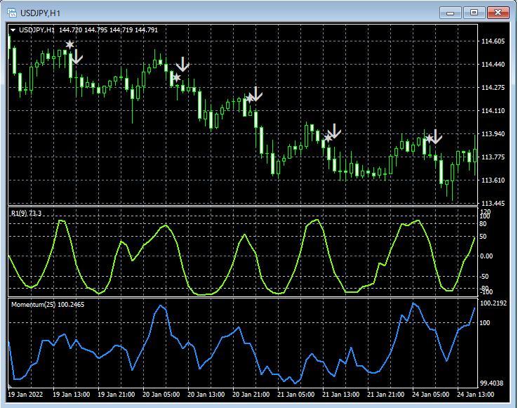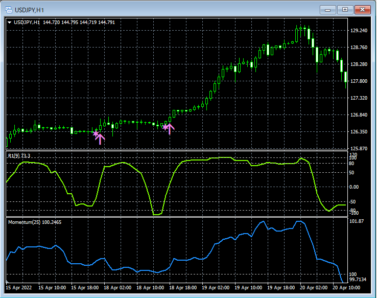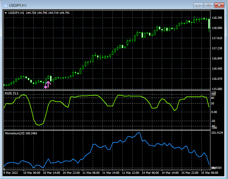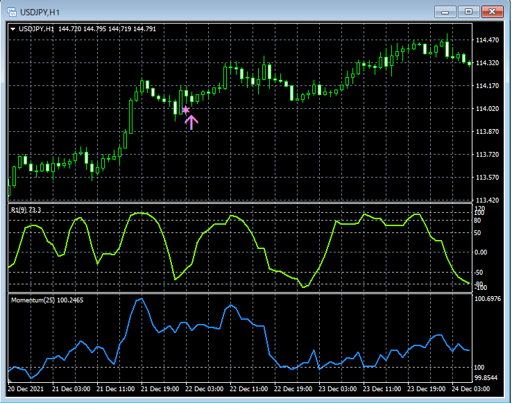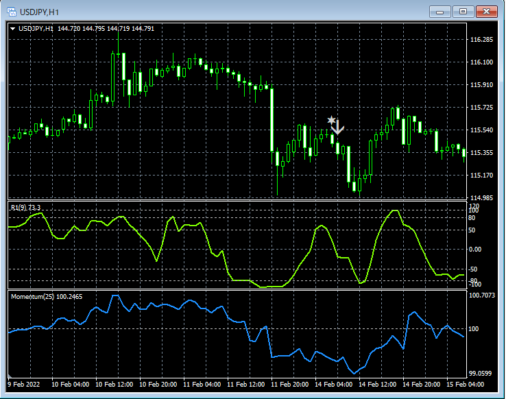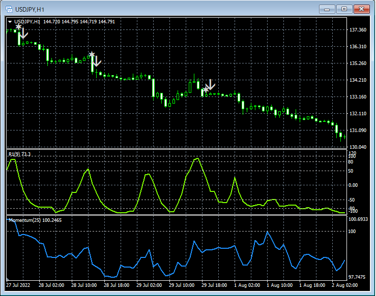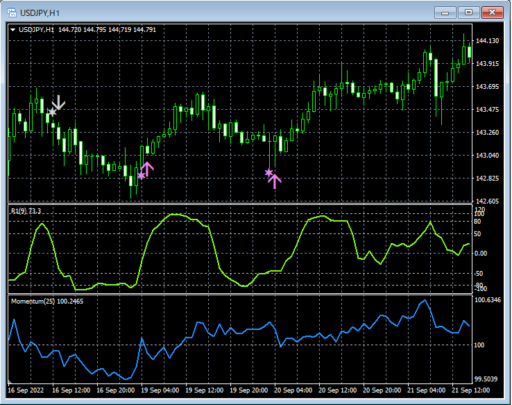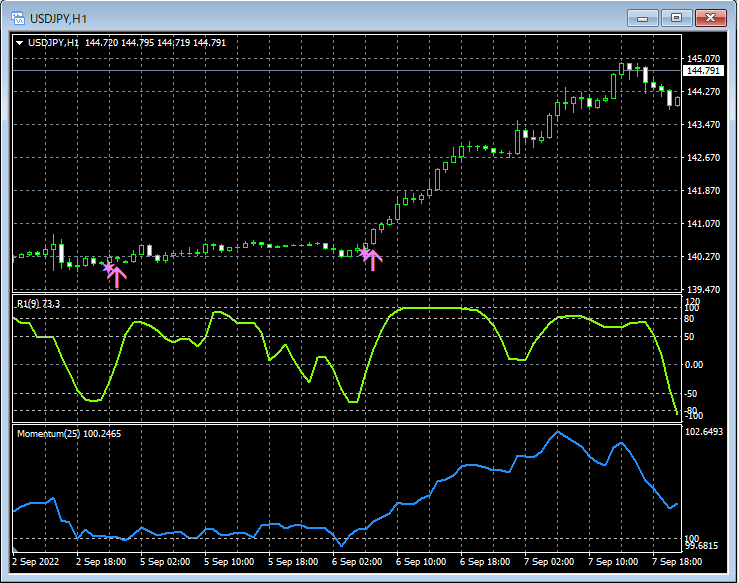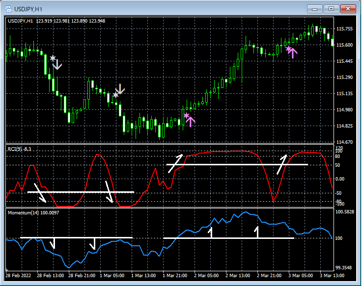 チャートの例(ドル円1時間足,設定を変更したもの)を追加しました。本ページの下の方に「◆RCIMOMのサインの例 2022年10月1日追加」という新たな項目を設けて19枚のチャートを掲載しました。
