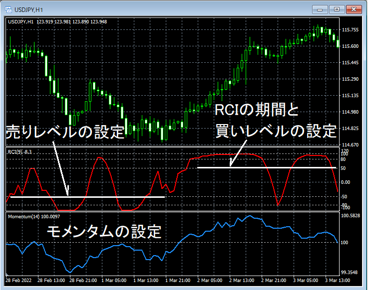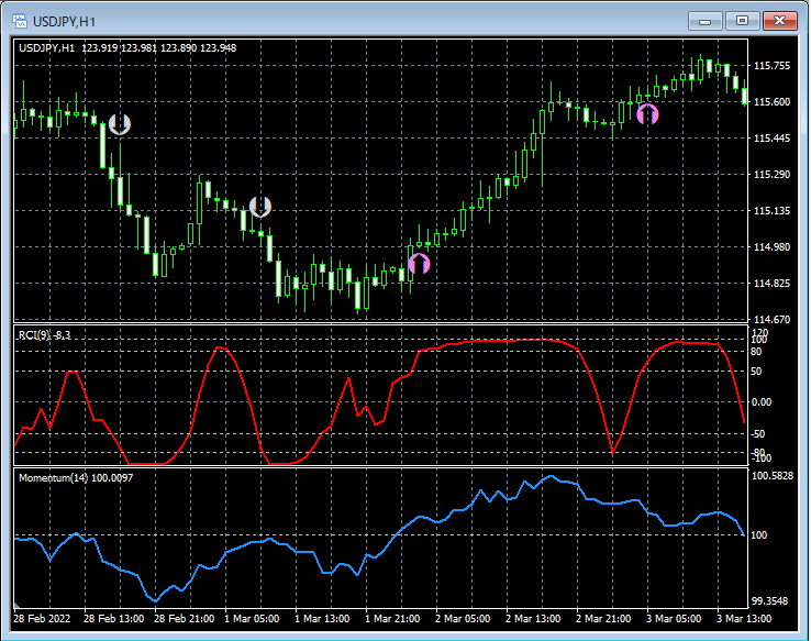 上図では説明の便宜上RCIとモメンタムを表示しておりますが、実際は本インジケーターを設置してもRCIとモメンタムは表示されません。