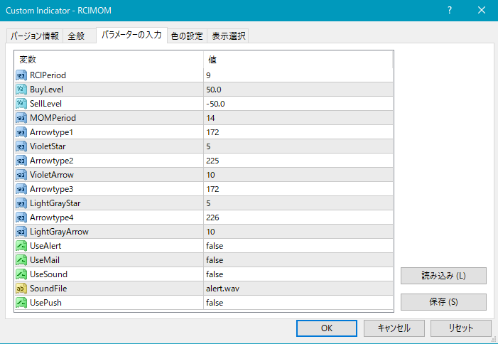 RCIの期間,RCIの買いレベル,RCIの売りレベル,モメンタムの期間をカスタマイズすることができます。設定の自由度が高いため、設定により表示されるサインは大きく変わります。