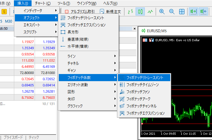 別売りの MetaTrader Mail Manager を利用すれば、通知メールにチャート画像を添付することも可能です。 MetaTrader Mail Manager についてはこちら ※このインジケーターは、チャートにセットしても何かが表示されるわけではありません。このインジケーターをチャートにセットした上で、チャート上にフィボナッチを引くと、そのフィボナッチでアラート機能や色分け機能が動作します。 もちろん、すでにチャート上にフィボナッチが引かれている状態で、このインジケーターをセットしても問題なく動作しますのでご安心下さい。 フィボナッチリトレースメントは、以下のようにMT5のメニューから追加することが可能です(ツールバーにボタンもあります)。フィボナッチエクスパンションも同様にメニューから追加可能です。
