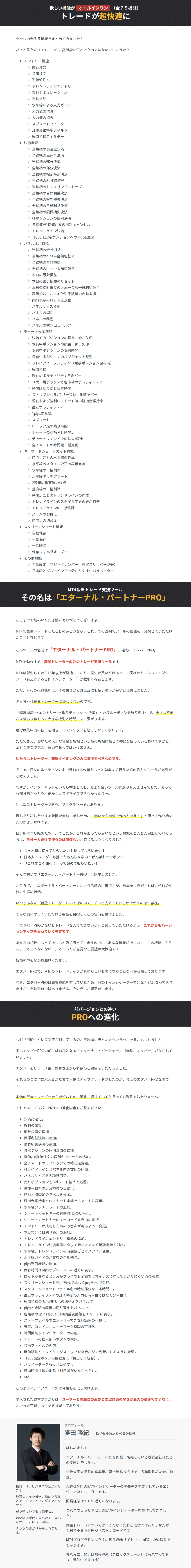 【SEOかつ商品アップロード条件対策用】裁量トレードが超快適になり、利益の最大化に貢献してくれるエターナル・パートナーPRO(エタパーPRO)。面倒な複利計算から解放され、直感的にSL/TPを設置でき、トレンドラインで好きな位置でエントリー/決済できます。また、パネルで複数銘柄の損益を一目で管理でき、大量ポジションを高速決済できます。ターミナルウィンドウも不要になり、高ロットでもドキドキしなくなります。他にも裁量トレードで欲しい機能がオールインワン(全75機能)。あなたのトレードを劇的に改善してくれるエタパーPROは、誰でも簡単に扱えるように設計されています。元々は自分のために作ったツールですが、改良を重ねていく中で、こんな便利なツールを自分だけで使うのは勿体ないと感じるようになり、エタパーPROは誕生しました。エタパーPROを使わなくても勿論トレードは可能です。ですが、どうせトレードするなら、面倒な作業を減らし、無駄なトレードを減らし、利益を最大化したいですよね?複利を最大限活かせないと全く同じトレードでも驚くほど利益に差が生まれてしまいます。たった数万円のツールへの投資と、得られていたはずのウン十万円の機会損失。あなたはどちらを選びますか?そして、トレーダーは職人です。職人は道具に妥協しません。なぜか?それは自身のパフォーマンスを最大化してくれることを知っているからです。あなたはいかがでしょうか?ぜひ、私と一緒に最高のMT4裁量トレード支援ツール「エターナル・パートナーPRO」でトレードしてみませんか?