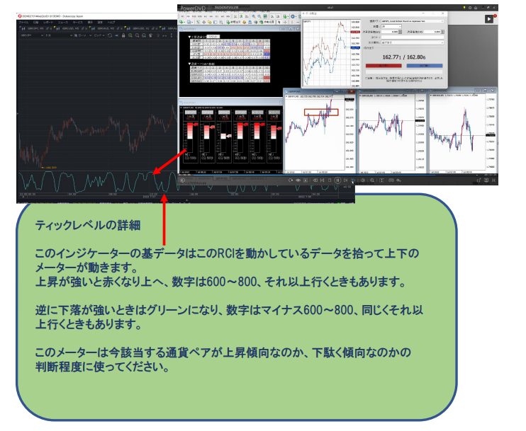 「スキャルピングの遅れないためのイグジット(精神的後押し)に使い、ローソク足がグッと伸びた直後に、サーっとティックインジが引いてくれるタイミングで気持ちよく利確している。継続して色が濃いようなら更に保持したまま様子見ができる」と。