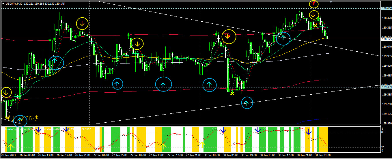 ※ 傾向として、隣り合った時間足通しが逆の色である場合は、見送りが吉です。