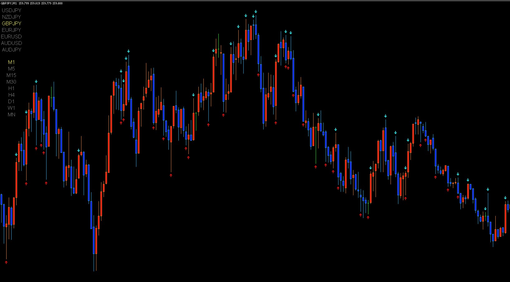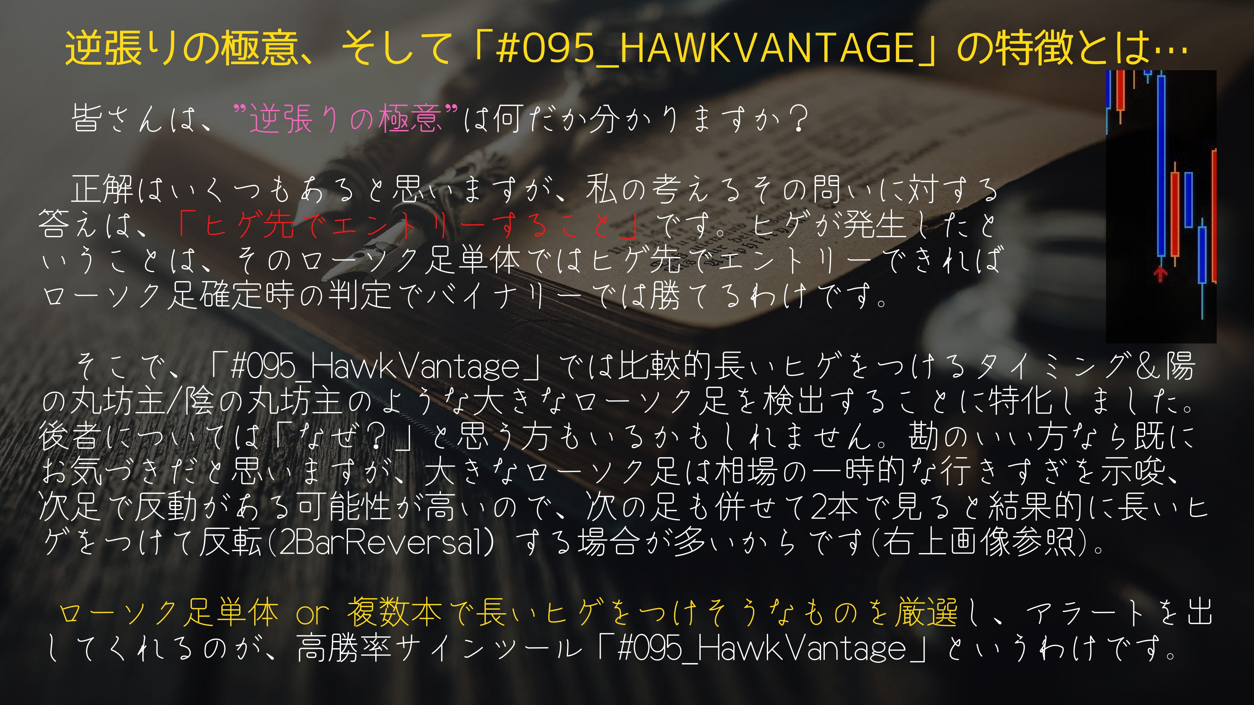 ・相場(ローソク足単体or複数)の一時的な行き過ぎを検知、反発狙いに特化したインジケータ。