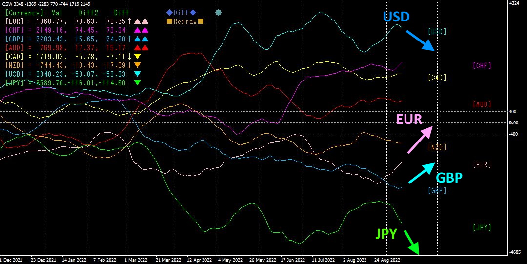 USDが最も強く、JPYが最も弱いのが、一目瞭然です。GBP、EURも比較的弱い位置にいますが、方向としては上を向いています。