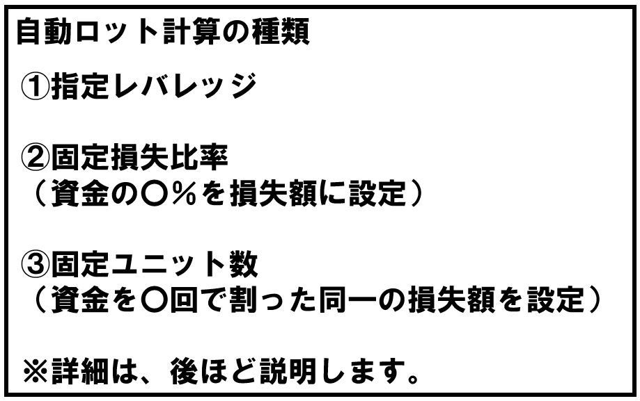 ①指定ロット、②指定レバレッジ、③固定損失比率、④固定ユニット数  【固定損失比率・補足】