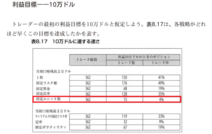 固定ユニット数は、書籍「システムトレード 基本と原則」にある資金管理システムの検証で、もっとも利益達成が早いシステムとして紹介されています。以下、書籍の引用となります。