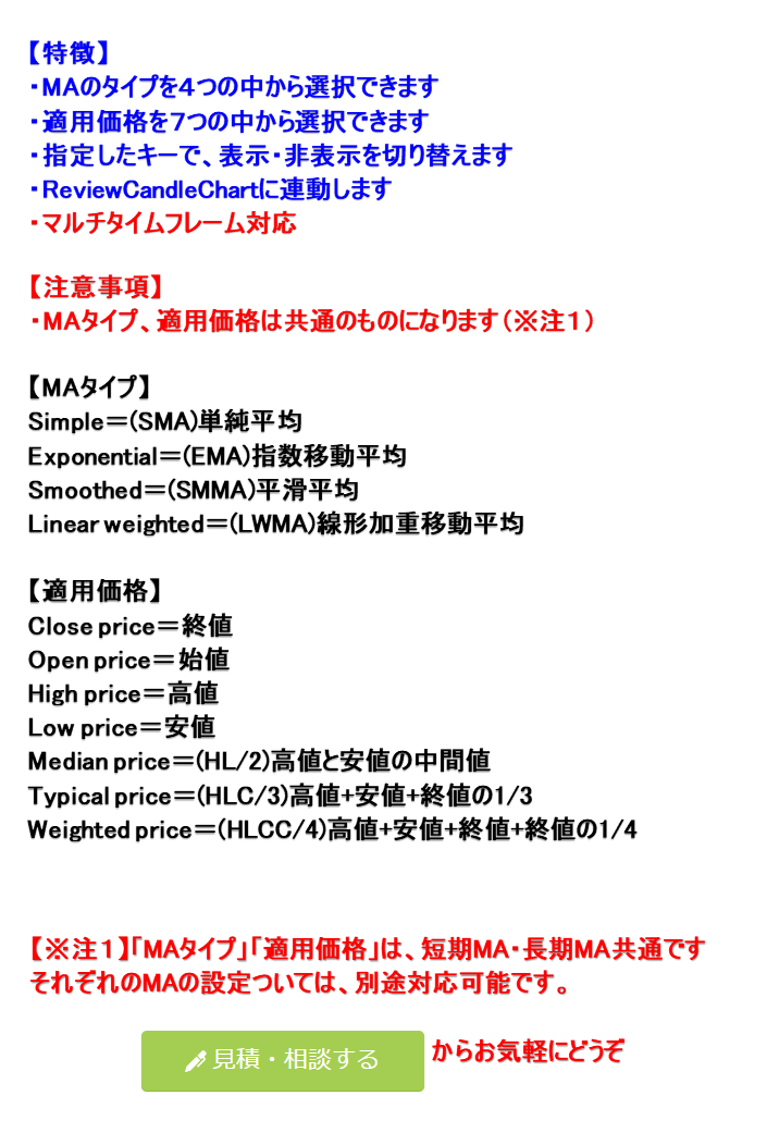 ・MetaTrader 5または、MetaTrader 4のバーションアップによる仕様変更での動作異常は可能な範囲で対応させて頂きますが保証は致しかねます。