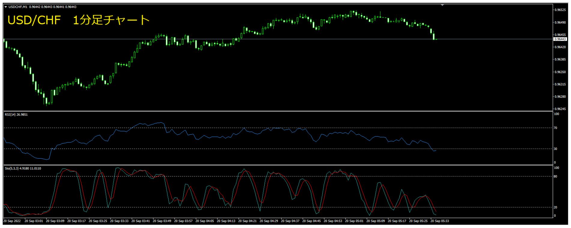 1.USD/CHFの1分足で陰線が連続しており、RSI、ストキャスティクス共に「売られすぎ」のサインが発生。