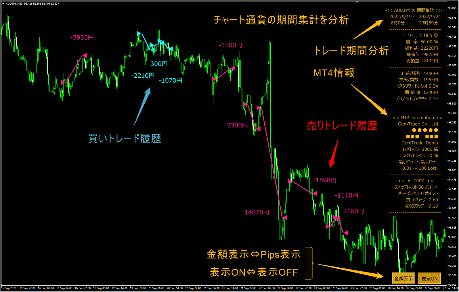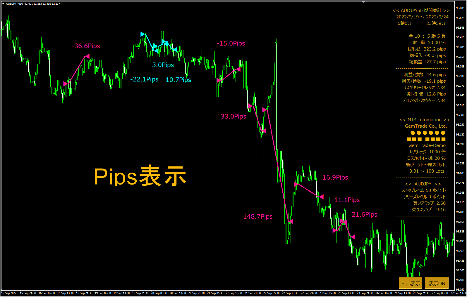 ※損益pipsが重なる場合はマウスでダブルクリック後ドラッグで位置を変えて下さい。