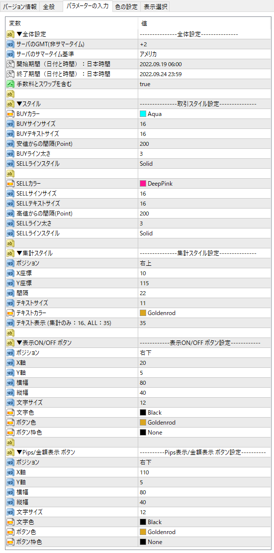 ▼表示ON/OFFボタン ▼Pips表示/金額表示ボタン
