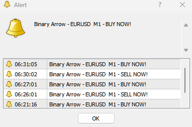 また、シグナルを通知するために3種類のアラートが用意されています。ポップアップアラート 2.サウンドアラート 3.メールアラート 4.モバイルアラート すべての通貨ペア、時間枠で使用可能 ルール:1.1分足/5分足チャート 2.1-3分の有効期限 3.5.ボラティリティの高い市場を避ける PutとCallのトレードの場合: ルール1:市場を見ながらシグナルを待つ ルール2:リストから通貨ペアを選択 ルール3:ソフトウェアに表示されるシグナルに従ってPUT/CALLをトレードする 確認を見たとき 時間枠:1分