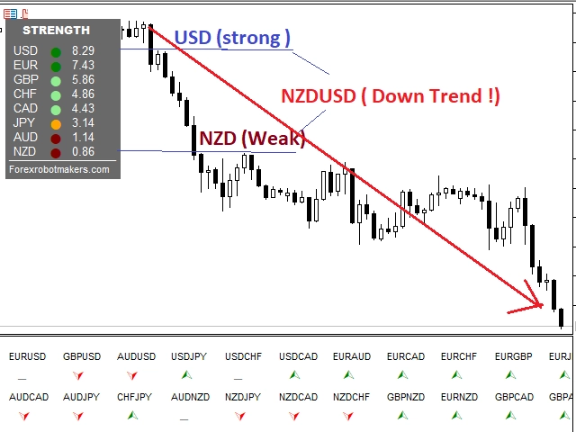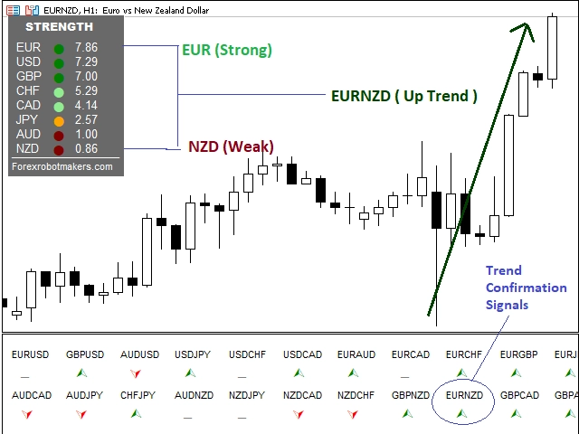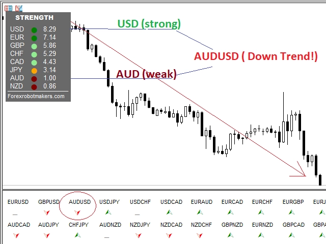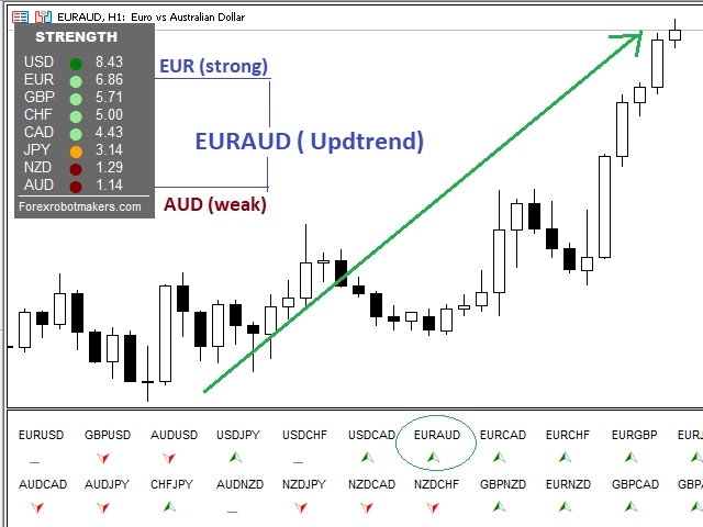 トレンドの方向性は?Advanced Currency Meterを使用すると、1つのウィンドウですべての通貨ペアのトレンドの方向を簡単に見ることができます。2つのパネルがあり、1つは異なる通貨の強さ、もう1つは通貨ペアのトレンドと強さを示しています。矢印がUPしているときは買い、DOWNしているときは売りです。