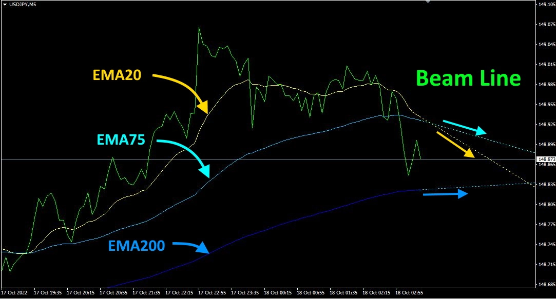 移動平均線にビームラインを付け加えます。ビームラインの角度や方向により直感的に移動平均線の動向を把握できます。ビームラインの色等はユーザーが自由に変更できます。