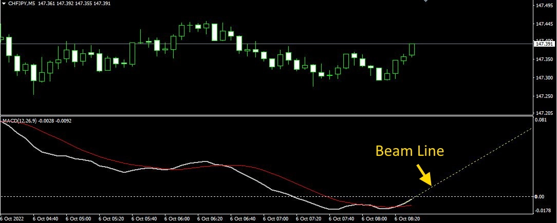MACDをヒストグラムでなく2本のラインで表示します。加えて、MACDのメイン線の方向を、ビームラインで指し示します。ビームラインの色はユーザーが自由に変更できます。