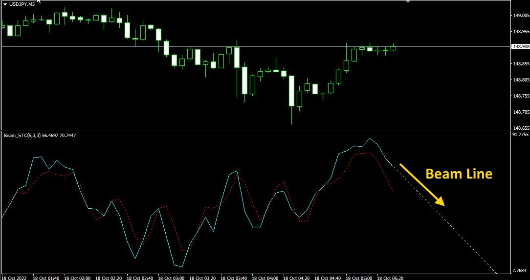 ストキャスティックスインジケータにビームラインを付け加えます。ビームラインの角度や方向により直感的にストキャスティックスの動向を把握できます。ビームラインの色等はユーザーが自由に変更できます。
