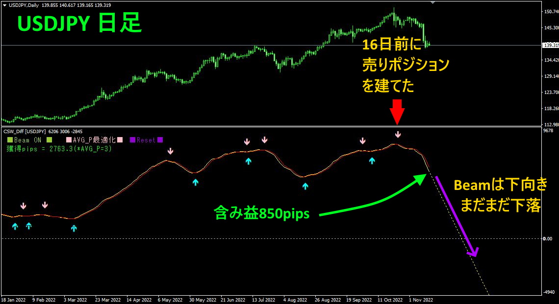 日足のトレードなので、デイトレやスキャルピングのように神経を擦り減らすことがなく、ゆったりとした「王道のトレード」が行えます。しかも、獲れる値幅が半端なく大きいため、数百pipsから数千pipsを、このインジケートで獲りに行くことができます。