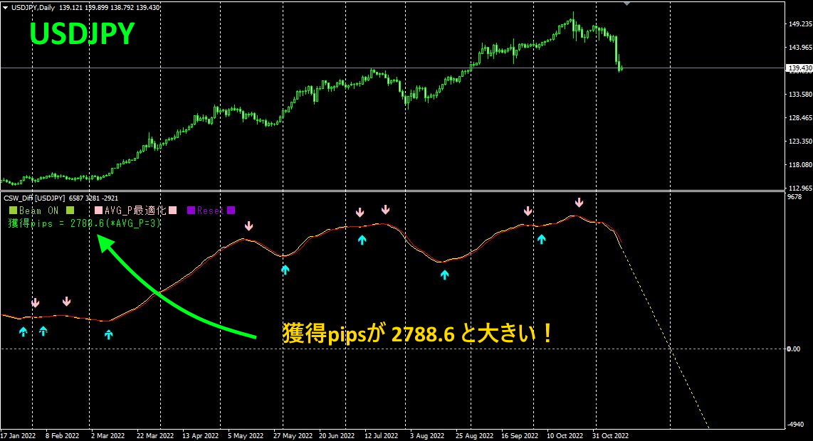 USDJPYは、通貨強弱が逆相関の関係に近いので、大きなpips数が獲れます。今年の円安による長期上昇トレンドに乗って、2022年4月から2022年11月までで、2788.6pipsが得られました。