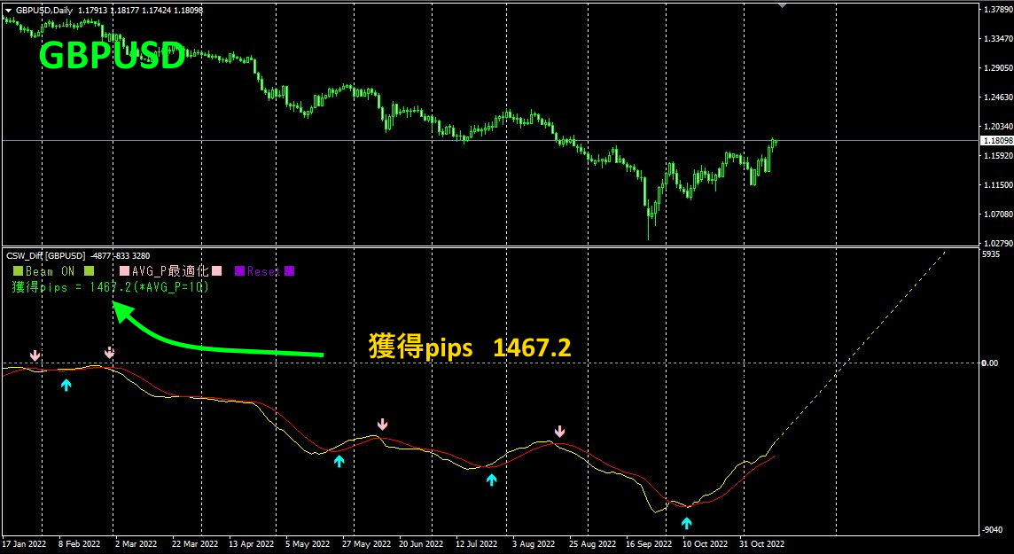 GBPUSDは、2022年4月から2022年11月までで、1467.2pipsが得られました。