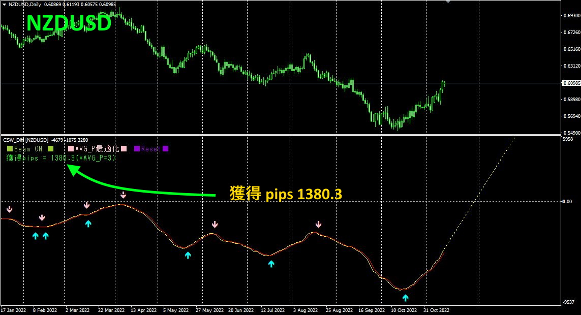 NZDUSDは、2022年4月から2022年11月までで、1380.3pipsが得られました。