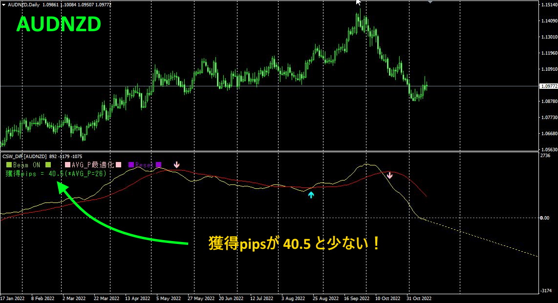 AUDNZDは、通貨強弱が順相関の関係にある為、本インジケータの利用に適していません。「バックテストpips利益計算機能」を使用して、利益になる通貨ペアを選択しましょう。