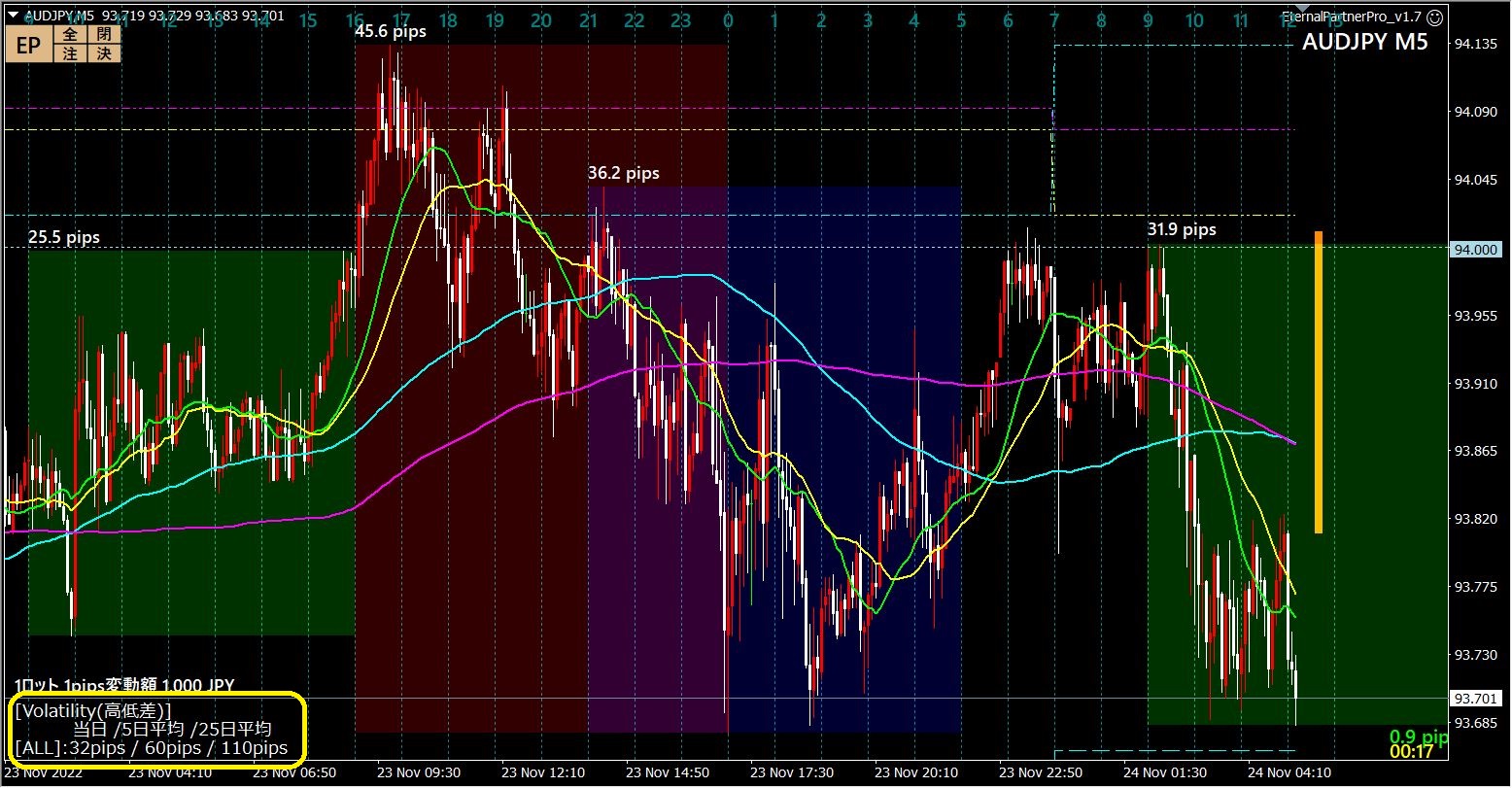 ここでは当日のボラティリティ、5日平均、25日平均を表示しています。