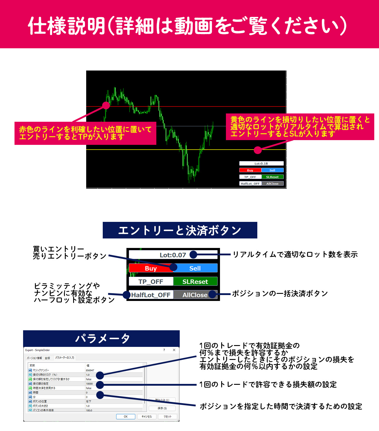 本ページをご覧いただきありがとうございます。 本商品はMT4専用の 裁量トレードを補助する資金管理ツールです。 日頃トレードする中で 損切り幅や通貨ペアによって、 許容損失額から適正なロット数を計算するのは大変ですよね。 その計算が遅れると せっかくのトレードチャンスを逃すことも… だからこそ、この計算をリアルタイムで自動で行ってくれる ツールはあなたの役に立ってくれるはずです! 詳細は下記の画像と動画にて説明しております。 ---------------------------------------------- 『ロットを自動で計算してくれるツール』はほしいけど、 「自分のイメージと違ったらなぁ…」と 購入リスクの不安を抱えてもいらっしゃる方も多いのではないでしょうか。 だからこそ、今回デモ購入だけで使える、 無料お試し版を用意いたしました。 ぜひお使いいただいて、 ご納得いただければ購入を検討していただければと思います! ▼デモ口座で使える無料お試し版は下記リンクから https://www.gogojungle.co.jp/tools/indicators/41671 ---------------------------------------------- また、ご購入後には 導入マニュアルとパラメータ解説資料も つけていますので使用される前に必ずご覧ください。 ▶ツール詳細解説動画 こちらの商品はMT4版です! お間違えのないようお気を付けください。 また使用する際は必ずデモ口座で試してからご利用ください。