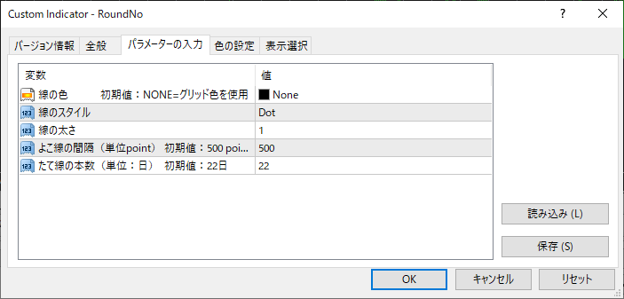 よこ線の間隔:価格線の表示間隔を指定します。単位:Points