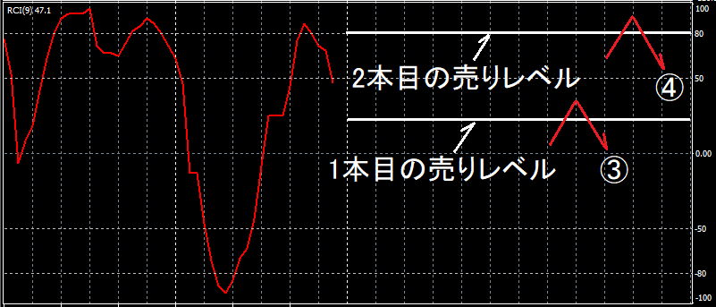上図の通り、RCIUpperLevel(初期値:100)とRCILowerLevel(初期値:-100)を設定することができます。  RCIがRCIUpperLevelより上にある場合には、実際の向きによらず、そのRCIの方向は上向きと判定されます。  また、RCIがRCILowerLevelより下にある場合には、実際の向きによらず、RCIの方向は下向きと判定されます。  なお、初期値のままとするとTRフィルターを使用しないのと同じことになります。 RCIの反転によりサインが点灯するか否かが決まる場合のTRフィルターの特徴 TRフィルター(RCIの動きの模式図) ①反転上昇開始位置がRCIUpperLevelより下なので買いサインが点灯します(TRフィルターにはかかりません)。 ②反転上昇開始位置がRCIUpperLevelより下なので買いサインが点灯します(TRフィルターにはかかりません)。 ③反転上昇開始位置がRCIUpperLevelより上なので買いサインは点灯しません(TRフィルターにかかります)。 ④反転下降が確定した時点でRCIがRCIUpperLevelより上を維持しているので売りサインは点灯しません(TRフィルターにかかります)。 ⑤RCIUpperLevelを上から下に抜けたときは売りサインが点灯します(反転下降したとみなされます)。 ⑥反転下降開始位置がRCILowerLevelより上なので売りサインが点灯します(TRフィルターにはかかりません)。 ⑦反転下降開始位置がRCILowerLevelより上なので売りサインが点灯します(TRフィルターにはかかりません)。 ⑧反転下降開始位置がRCILowerLevelより下なので売りサインは点灯しません(TRフィルターにかかります)。 ⑨反転上昇が確定した時点でRCIがRCILowerLevelより下を維持しているので買いサインは点灯しません(TRフィルターにかかります)。 ⑩RCILowerLevelを下から上に抜けたときは買いサインが点灯します(反転上昇したとみなされます)。