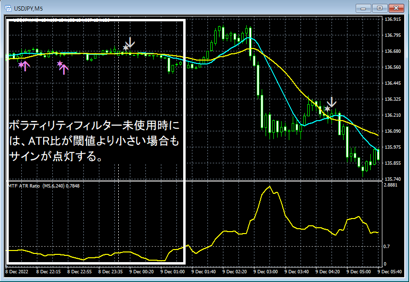 本商品に含まれる全ての矢印インジケーターには、ボラティリティ(値動き)の小さな相場を避けることを目的として、ATR比を使ったマルチタイムフレーム対応のボラティリティフィルターが実装されています。  ボラティリティフィルターを利用する場合、ATR比が指定した閾値(ATR_Ratio_Level)より大きい場合のみサインが点灯します。  ATR比短期ATR/長期ATR で定義される値です。  上図で赤い枠で囲った項目がATR比を使ったボラティリティフィルターの設定項目となっています。  MTF(マルチタイムフレーム)に対応しています。 ATR_Filter:  ボラティリティフィルターを使用する場合には true、使用しない場合には false を選択する。 TimeFrame:  フィルターに使うATR比を計算するタイムフレームを設定します。  現在のタイムフレームと同じタイムフレームあるいはそれより上位の足(長期の足)を指定することができます。  現在のタイムフレームより下位の足(短期の足)を指定した場合は現在のタイムフレームを指定したことと同じことになります。  上図のNote1~Note4にあるように、TimeFrameの設定項目で指定できる値とタイムフレームとの対応は下記の通りです。例えば、1時間足を指定したい場合には60と入力します。   現在の足: 0   1分足:   1   5分足:   5   15分足:  15   30分足:  30   1時間足: 60   4時間足: 240   日足:  1440   週足: 10080   月足: 43200 ATR_Long_Period:  長期ATRの期間を設定します。 ATR_Short_Period:  短期ATRの期間を設定します。 ATR_Ratio_Level:  ATR比が指定した閾値(ATR_Ratio_Level)より大きい場合のみサインが点灯します。 上記の各設定項目における設定値については、ユーザ様それぞれの手法,通貨ペアやタイムフレーム,その時々における相場状況などに応じてお好みの設定でご利用下さい。 チャート例 ボラティリティフィルターなし (ATR_Filter = false) ボラティリティフィルターあり (ATR_Filter = true, TimeFrame = 0, ATR_Long_Period = 240, ATR_Short_Period = 6, ATR_Ratio_Level = 0.7)