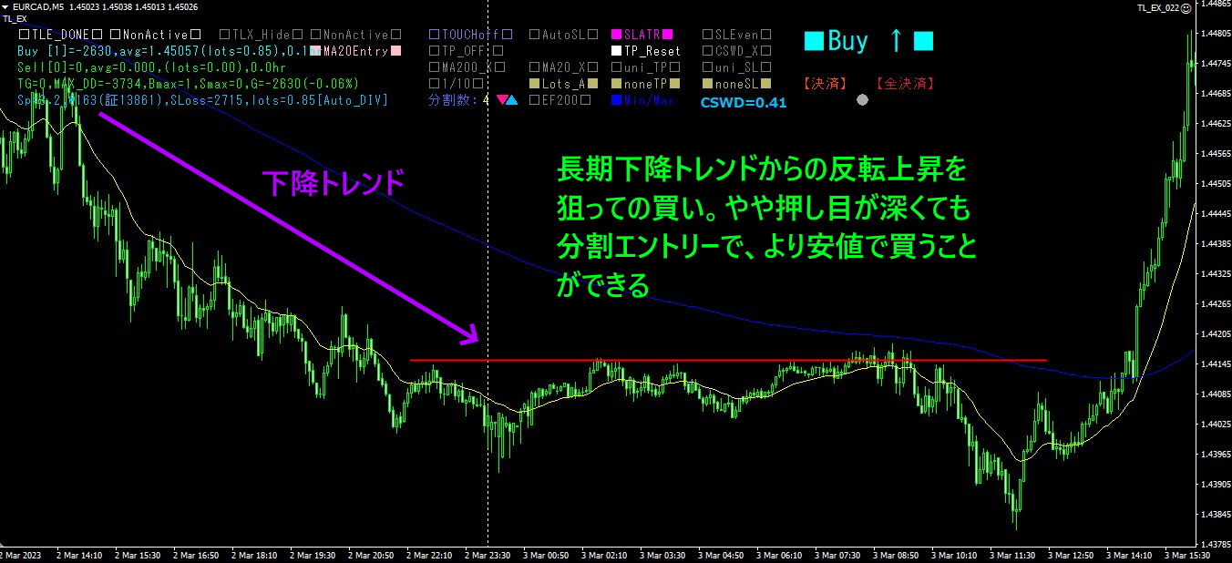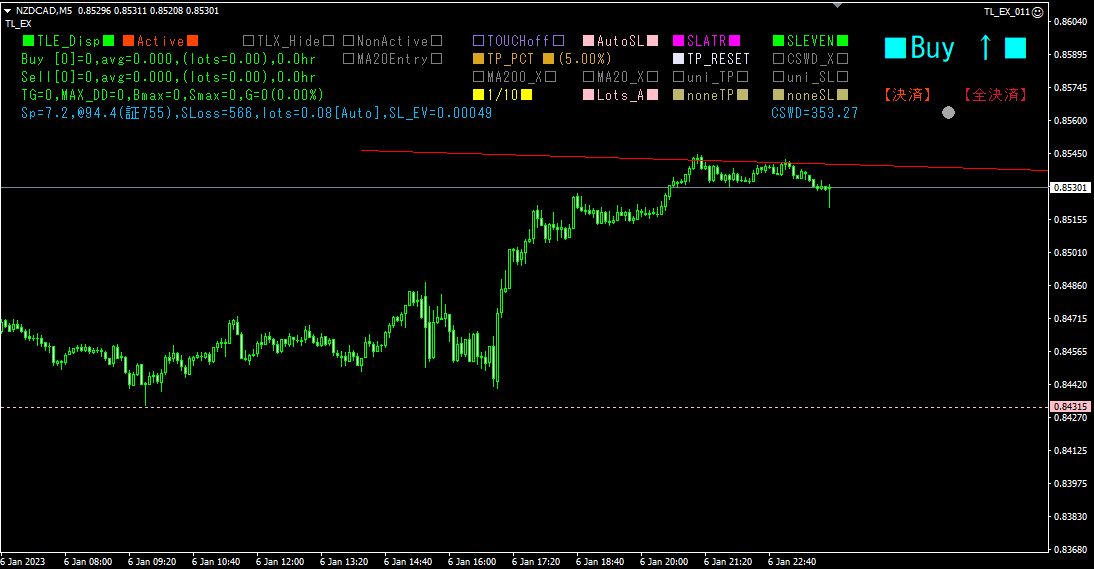 「Trend Line EX」は、半自動のEAですので、EAが走ってさえいれば、指定した機能が有効になります。もちろん、裁量との併用も可能です。