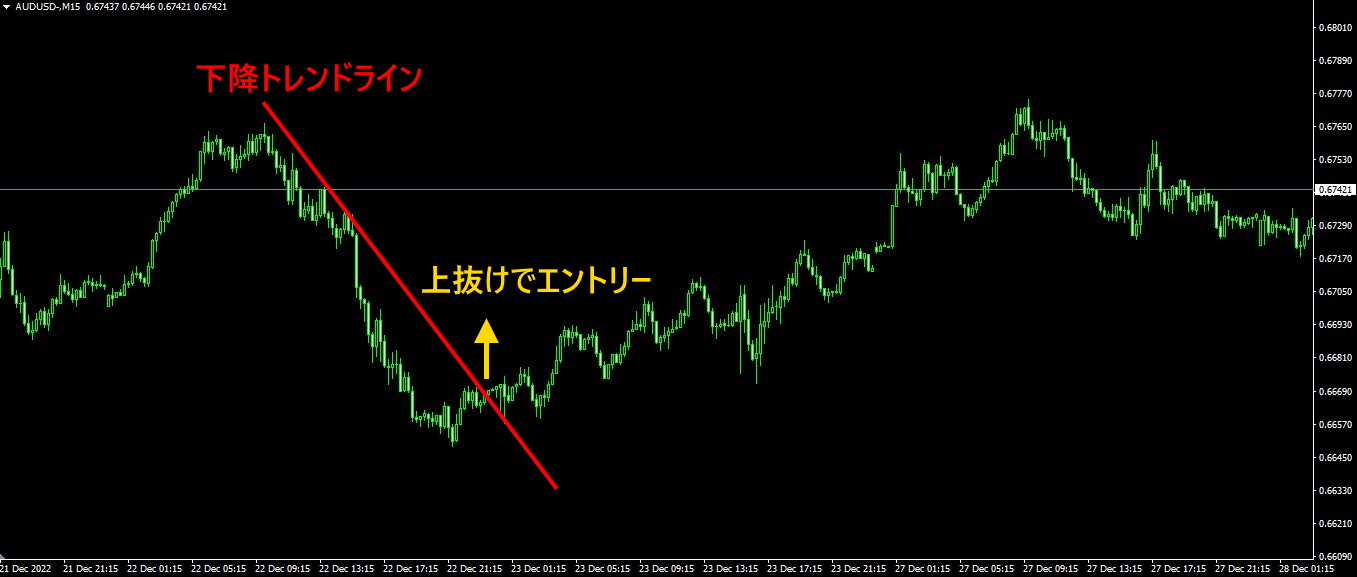 トレンドラインをローソク足が越えたら、エントリーする機能です。