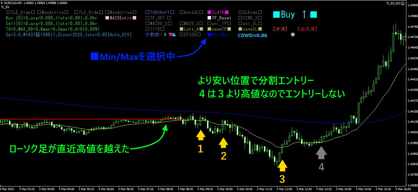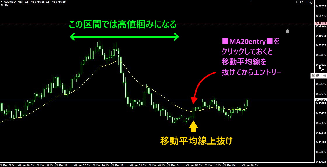 ■MA20entry■ をクリックしておけば、ローソク足が移動平均線を抜けてからエントリーします。